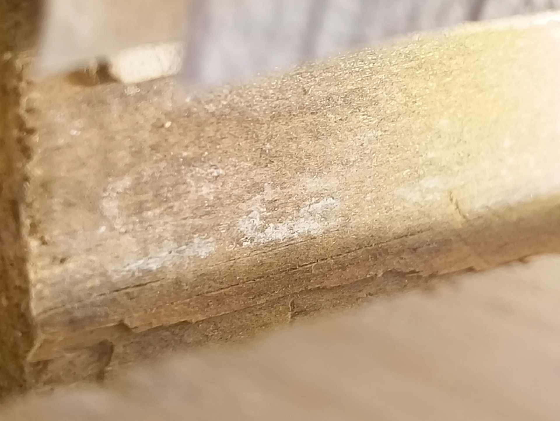 Syy kysymykseen on se, että ollaan etsimässä syytä miksi keskellä taloa olevan takan ympäriltä listojen alta tulee outoa hajua. Talossa yleisesti terveen puun tuoksu, mutta tuolta kuvan paikasta tulee hieman epämiellyttävämpi tuoksu. Nyt huomasin listoja purkamalla, että tuo tuossa alkuperäisessä 50-luvun puussa on tuollaista valkeaa.